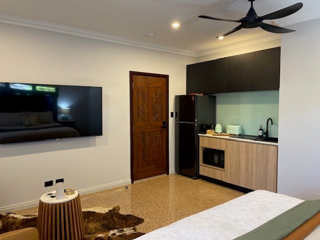 The Frangipani 1 Bedroom Villa is a private room with characteristics of a luxury hotel room. Your own kitchenette with full size fridge and freezer. Modern outdoor bathroom attached. Complete with high quality designer furnishings. Deck area with seating, BBQ and courtyard.